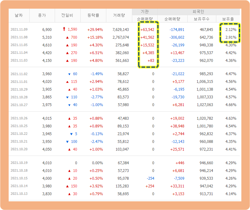 기관 투자자의 경우 최근 들어 거래량이 증가함과 동시에 매수세가 크게 들어오고 있습니다.