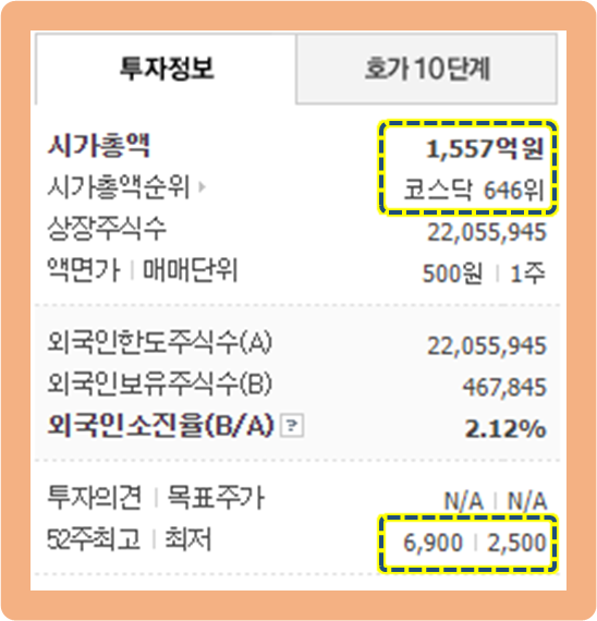 52주 최고가는 6,900원이며, 52주 최저가는 2,500원이네요.
