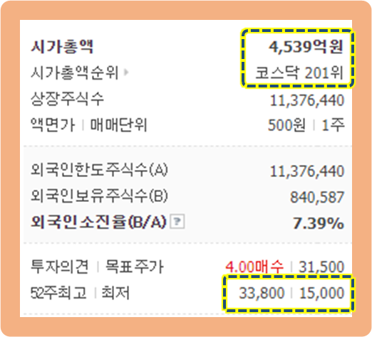 현재 기준으로 시총 약 4,539억원으로 코스닥 201위 기업입니다.
