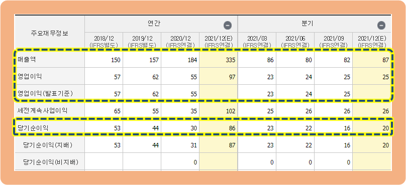 하지만 아쉽게도 연간 영업이익과 당기순이익은 2020년 기준으로 각 55억원, 30억원을 기록하면서 전년도 대비 다소 떨어진 상황이네요.