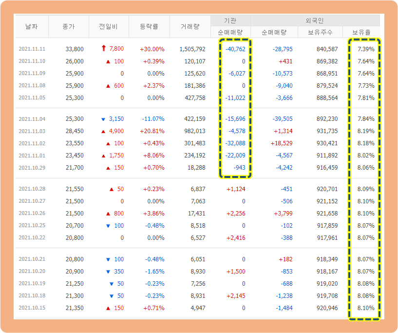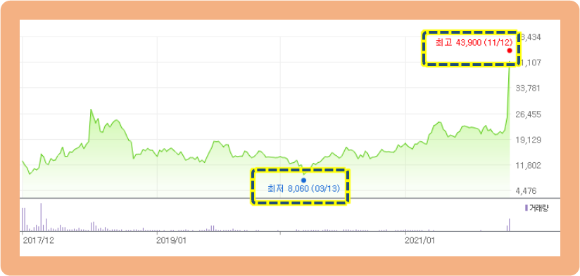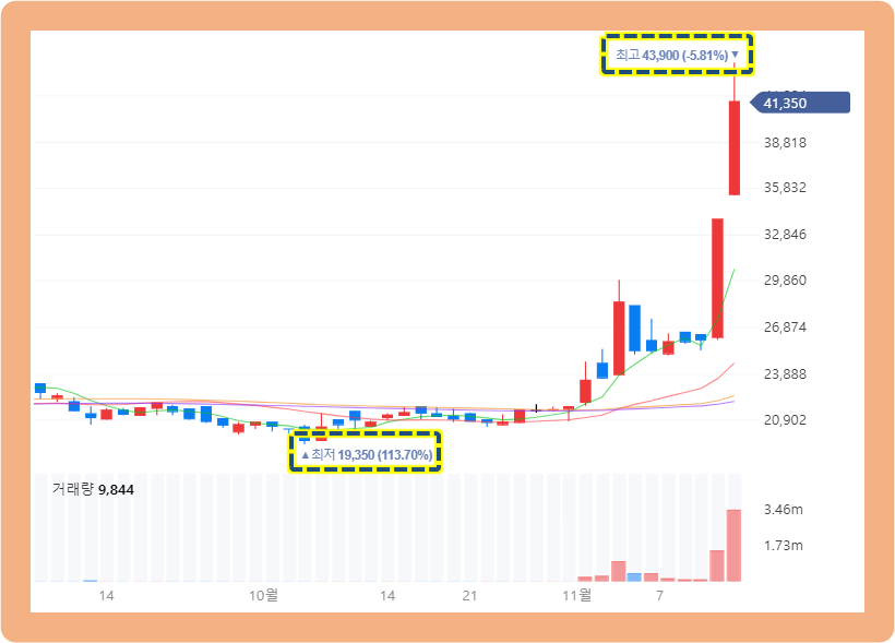그리고 거래량 폭발과 함께 상승세가 계속 이어지면서, 2021년 11월 12일에는 최고 43,900원까지 터치한 상황이네요.