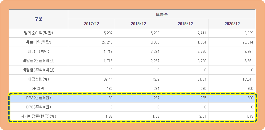 2017년 : 180원 / 2018년 : 234원 / 2019년 : 285원 / 2020년 : 300원의 배당금을 주주분들에게 지급해주고 있는데요.