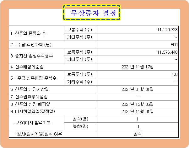 신주 배정기준일은 2021년 11월 17일이며, 신주의 상장 예정일은 2021년 12월 6일이라고 합니다.