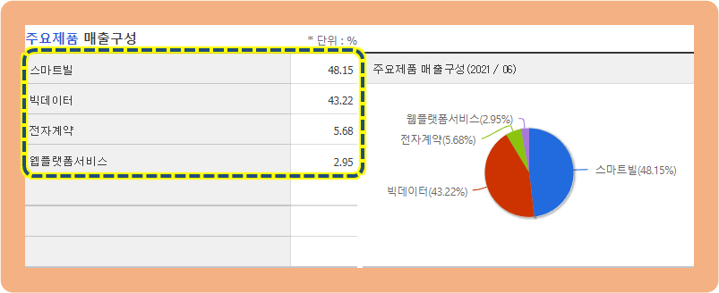 전자세금계산서 발행서비스 사이트인 스마트빌에서 나오는 매출이 약 48.15% 수준으로 총 매출의 절반을 차지하고 있구요.