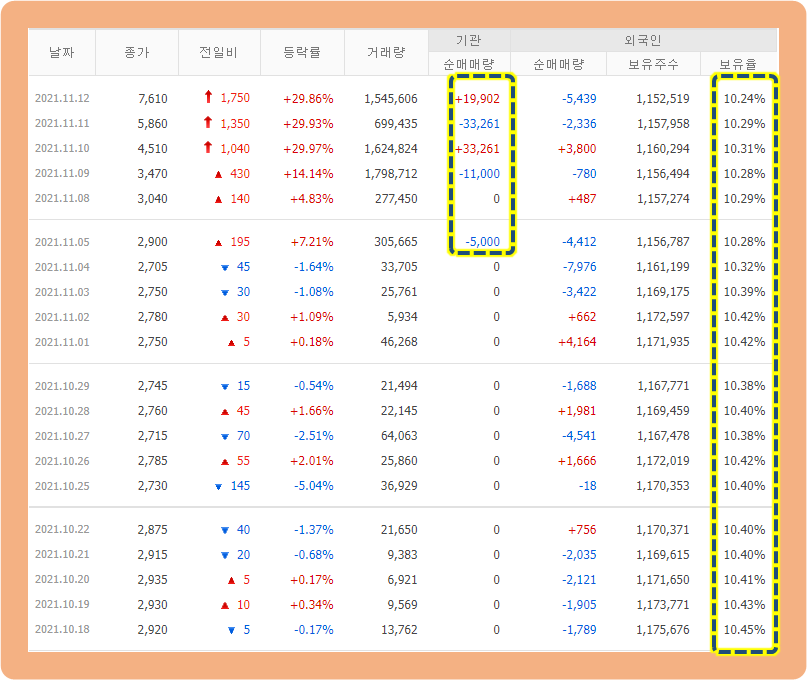 최근들어 기관투자자의 거래량이 늘어났는데요. 매수세와 매도세는 균형을 이루고 있는 모습입니다.