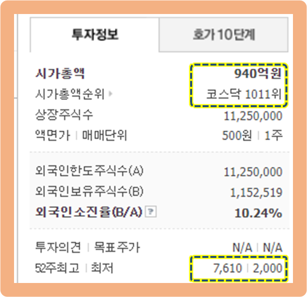 52주 최고가는 7,610원이고, 52주 최저가는 2,000원이네요.