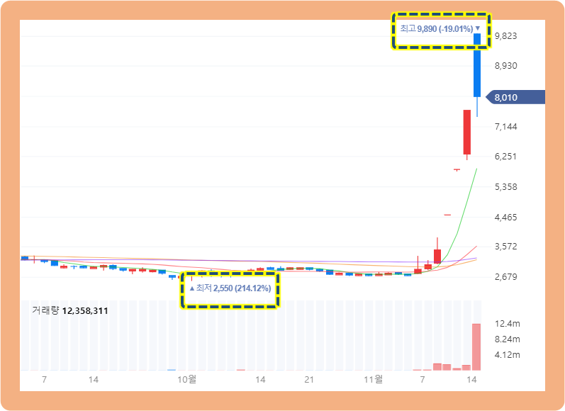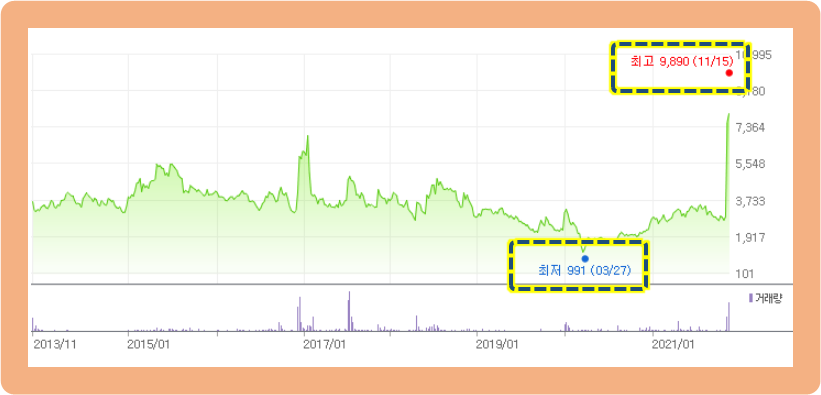 그리고 쩜상을 보이는 등 급격한 상승세가 지속되면서, 2021년 11월 15일에는 주가가 최고 9,890원까지 터치해버렸죠.