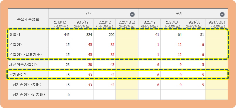 연간 영업이익과 당기순이익은 2020년 기준 각 -35억원, -43억원 손실을 기록하면서 2년 연속 적자를 이어오고 있는 모습이네요.