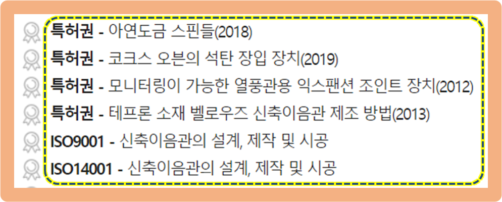 특허권 : 아연도금 스핀들, 코크스 오븐의 석탄 장입 장치, 모니터링 가능한 익스팬션 조인트 장치, 테프론 소재 벨로우즈 신축 이음관 제조법 등이 있구요.