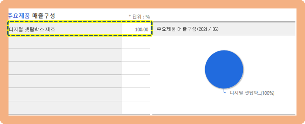 디지털 셋탑박스 제조 부문이 100% 수준으로 독차지하고 있는 상황입니다.