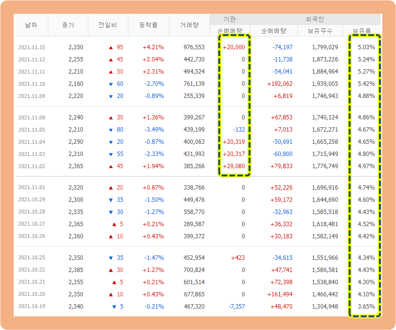최근 들어 기관 투자자의 거래량이 생김과 동시에 매수세가 유입되고 있는 모습이구요.