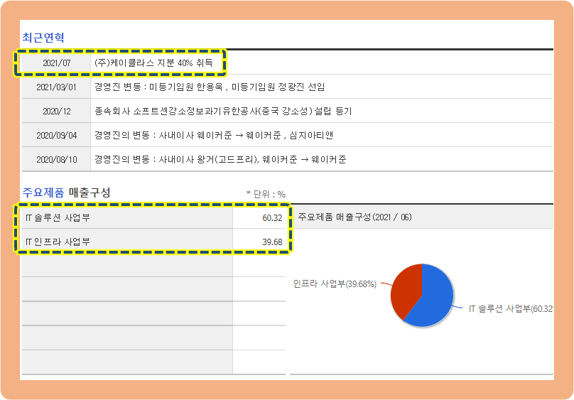 그리고 주요 매출 비중을 비교해보면, IT 솔루션 사업부문이 약 60.3%를 차지하고 있으며 IT 인프라 사업부문이 약 39.7%를 차지하고 있습니다.