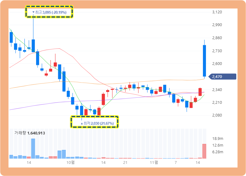 그 이후 최근까지 박스권 등락을 이어오다가, 11월 16일에는 장 초반부터 주가가 급등하면서 최고점 2,840원까지 올라갔었죠.