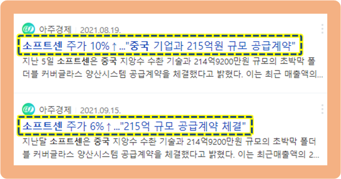 지난 2021년 8월 5일, 소프트센이 중국기업인 지앙수 수촨 기술(JIANGSU SUCHUAN TECHNOLOGY)과 약 215억 규모의 공급 계약을 체결했다고 발표했습니다.