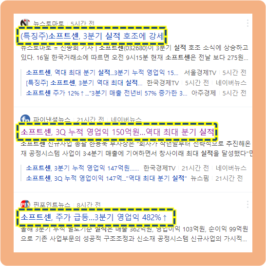 2021년 11월 15일, 소프트센의 2021년 3분기 실적이 역대 최대 분기 성적을 기록했다고 발표되었습니다.