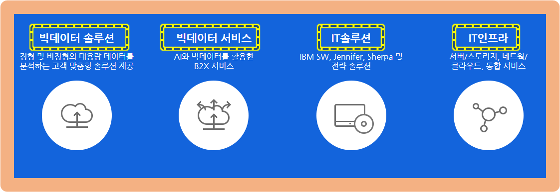 이 기업의 사업 분야로는 스토리지, 서버 등의 인프라, 솔루션 등을 제공하는 ICT 사업부문과 IT 서비스, 솔루션 공급 등을 서비스하는 전략 사업 부문으로 구분되어 있습니다.
