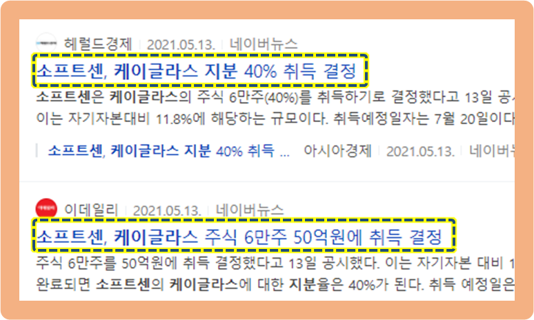 우선, 지난 2021년 5월 소프트센이 케이글라스의 지분 약 40%에 달하는 주식 6만주 취득 결정 공시를 발표했습니다.
