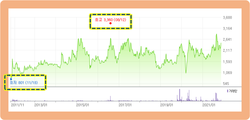 최저가는 2011년 11월에 기록한 801원이며, 최고가는 2016년 8월에 기록한 3,360원입니다.