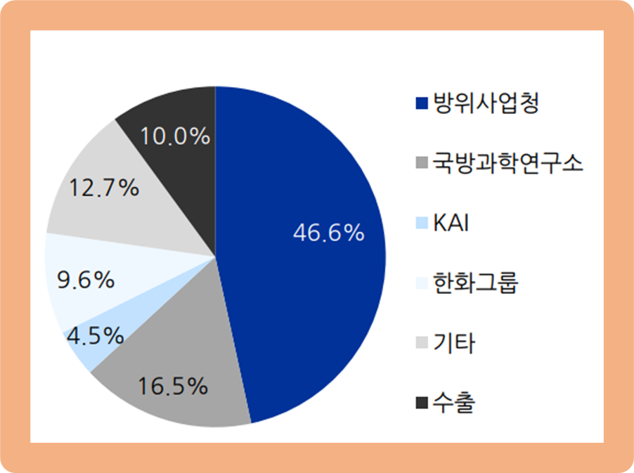 방위사업청이 약 46.6% 수준으로 가장 많은 비중을 차지하고 있구요.