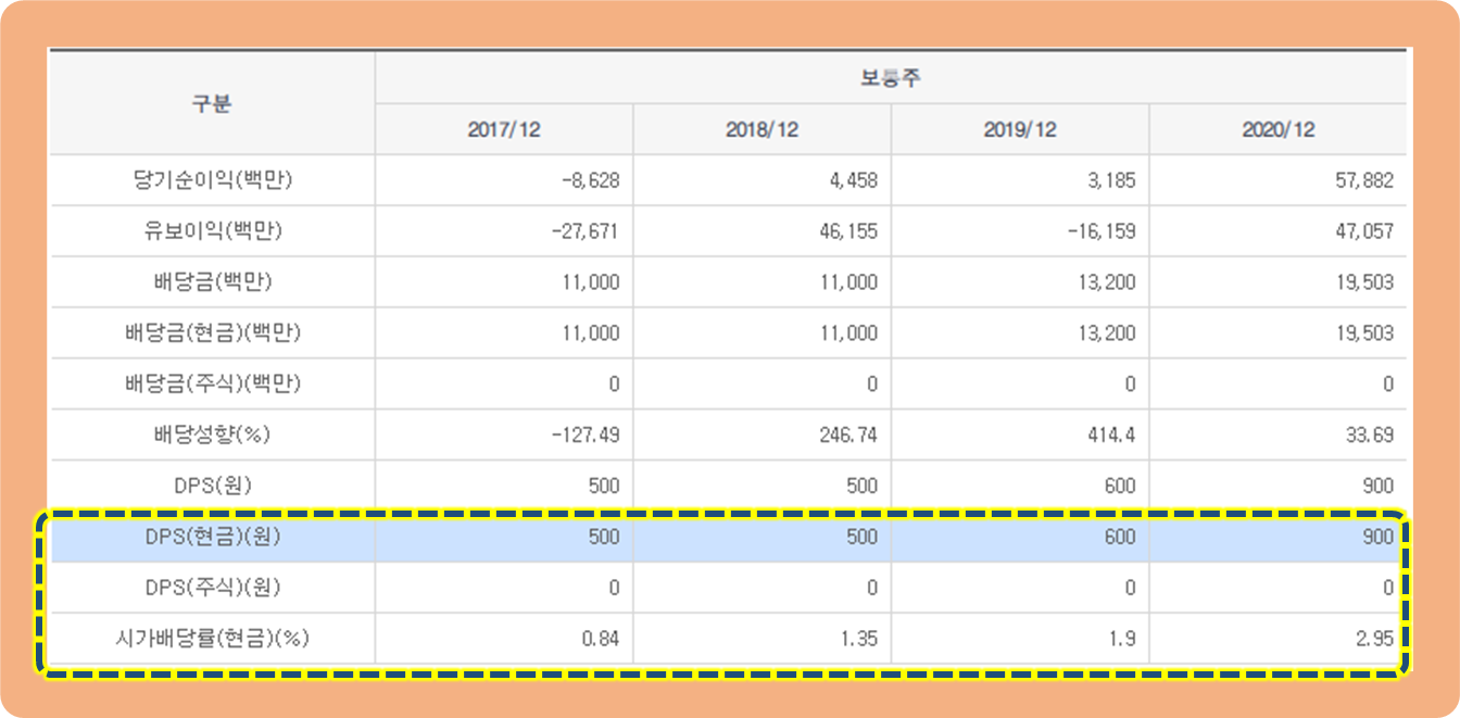 2017년 : 500원 / 2018년 : 500원 / 2019년 : 600원 / 2020년 : 900원의 배당금을 지급해주고 있는데요.