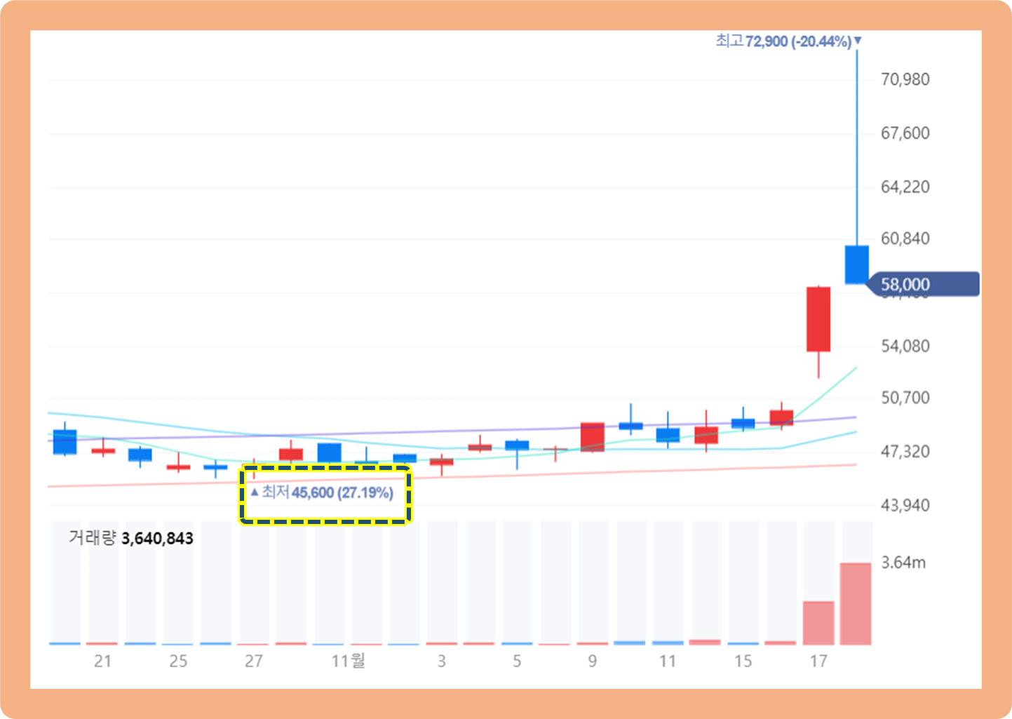 2021년 11월 17일부터 주가가 갑자기 급등하기 시작하더니, 다음 날인 11월 18일에도 상승세가 이어지면서 장 초반에 최고 72,900원까지 터치했습니다.