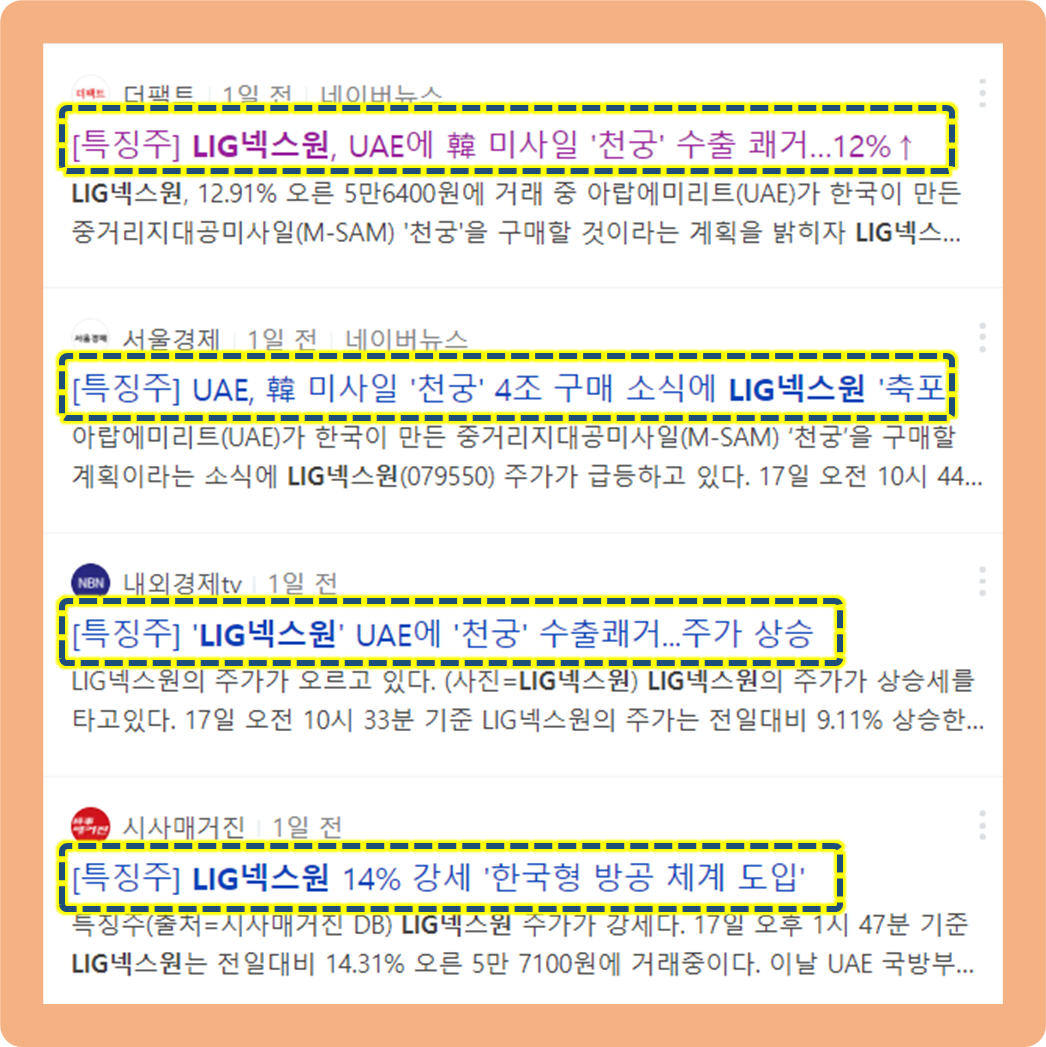 현재까지도 LIG넥스원이 천궁의 레이더와 미사일 개발 및 양산을 담당하고 있기 때문에, 이 소식으로 인해 수혜를 받으며 주가가 강세를 보인 것입니다.