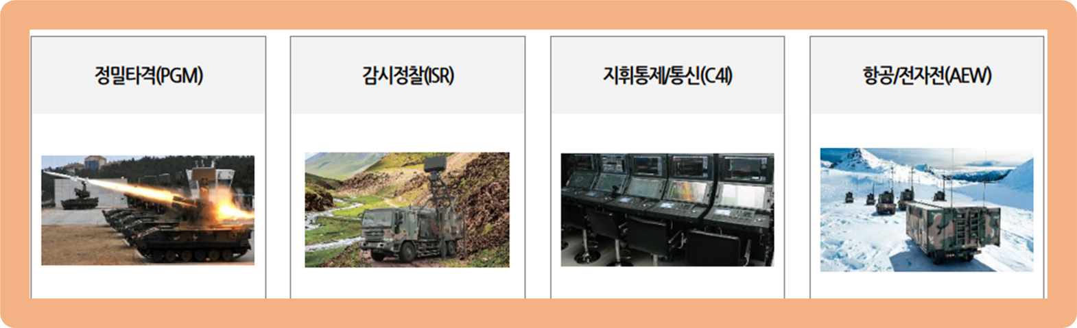 보유 제품군으로는 PGM(정밀타격), AEW(항공전자/전자전), C4I(지휘통제/통신), ISR(감시정찰) 등의 분야로 세분화되어 있죠.