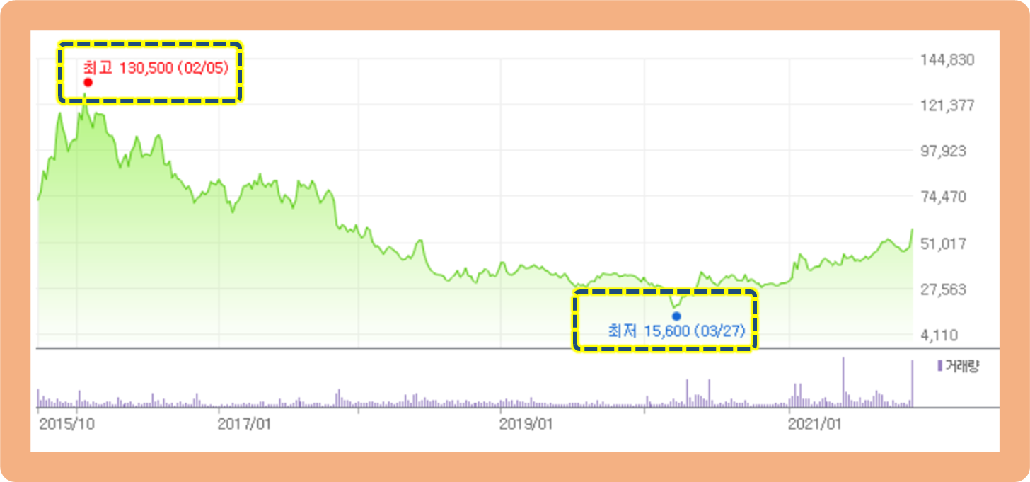 최고점은 2016년 2월에 기록한 130,500원이며, 최저가는 2020년 3월에 기록한 15,600원입니다.
