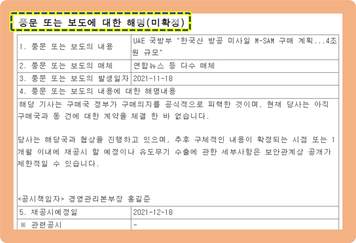추후 구체적 내용이 확정되는 시점 혹은 1개월 이내에 재공시할 예정이지만 유도무기 수출에 대한 세부사항은 보안관계상의 이유로 공개가 다소 제한적일 수 있다는 내용의 공시네요.