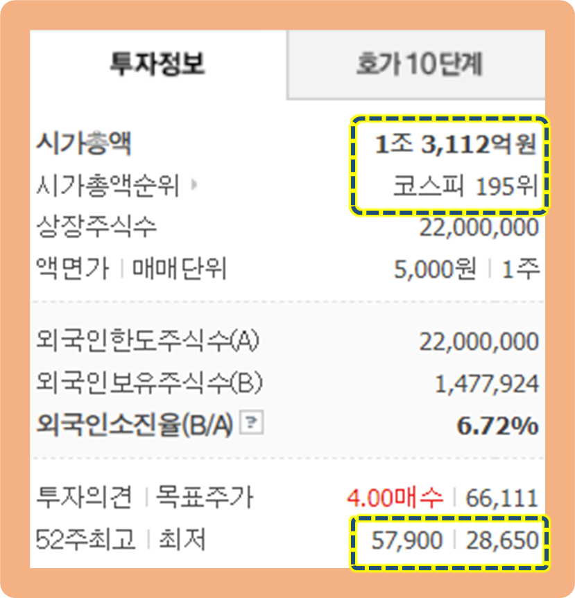 지난 52주간 최고가는 57,900원이며, 52주간 최저가는 28,650원이네요.