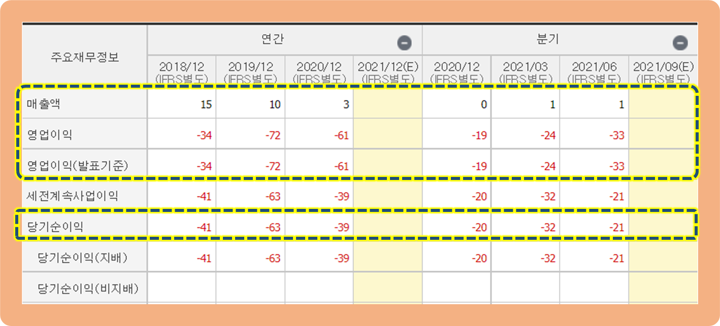 또한, 2021년 3분기까지의 분기별 영업이익과 당기순이익도 현재까지 계속 적자를 기록하고 있기 때문에, 2021년 연간 실적도 적자를 기록할 것으로 보이네요.
