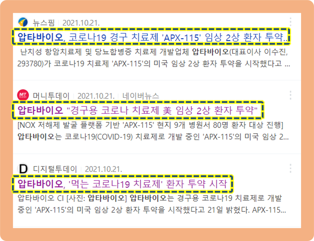 그리고 2021년 10월 21일, 압타바이오가 경구용 코로나 치료제로 개발하고 있는 APX-115의 미국 임상 2상 환자 투약을 착수했다고 발표했습니다.