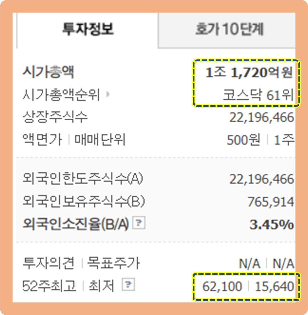 52주 최고가는 62,100원이며, 52주 최저가는 15,640원이네요.