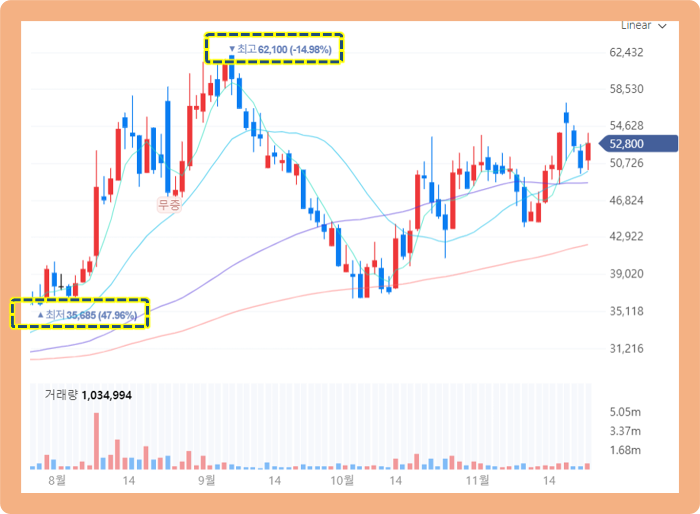 2021년 8월초부터 주가가 갑자기 상승하기 시작하더니, 2021년 9월 6일에는 최고 62,100원까지 터치했습니다.