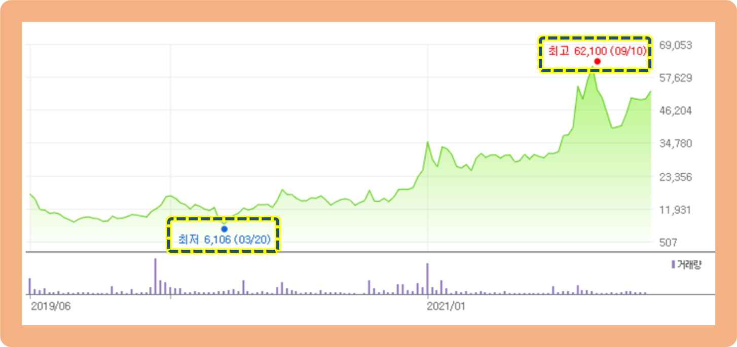 최저가는 2020년 3월에 기록한 6,106원이며, 최고가는 2021년 9월에 기록한 62,100원으로 무려 10배 넘게 차이나네요.
