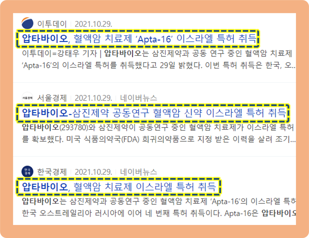 2021년 10월 29일, 이스라엘에서 압타바이오가 혈액암치료제인 Apta-16에 대해 특허를 취득했다고 발표했습니다.