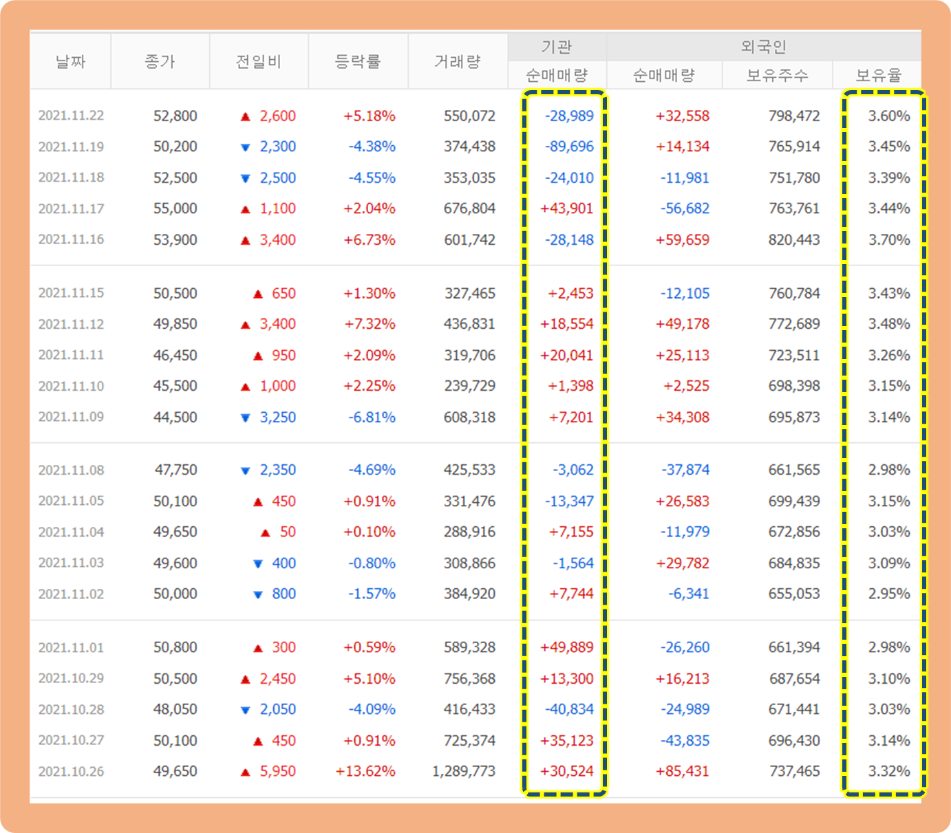 지난 한 달 동안 기관 및 외국인 투자자의 매매 추이를 살펴보도록 하겠습니다.