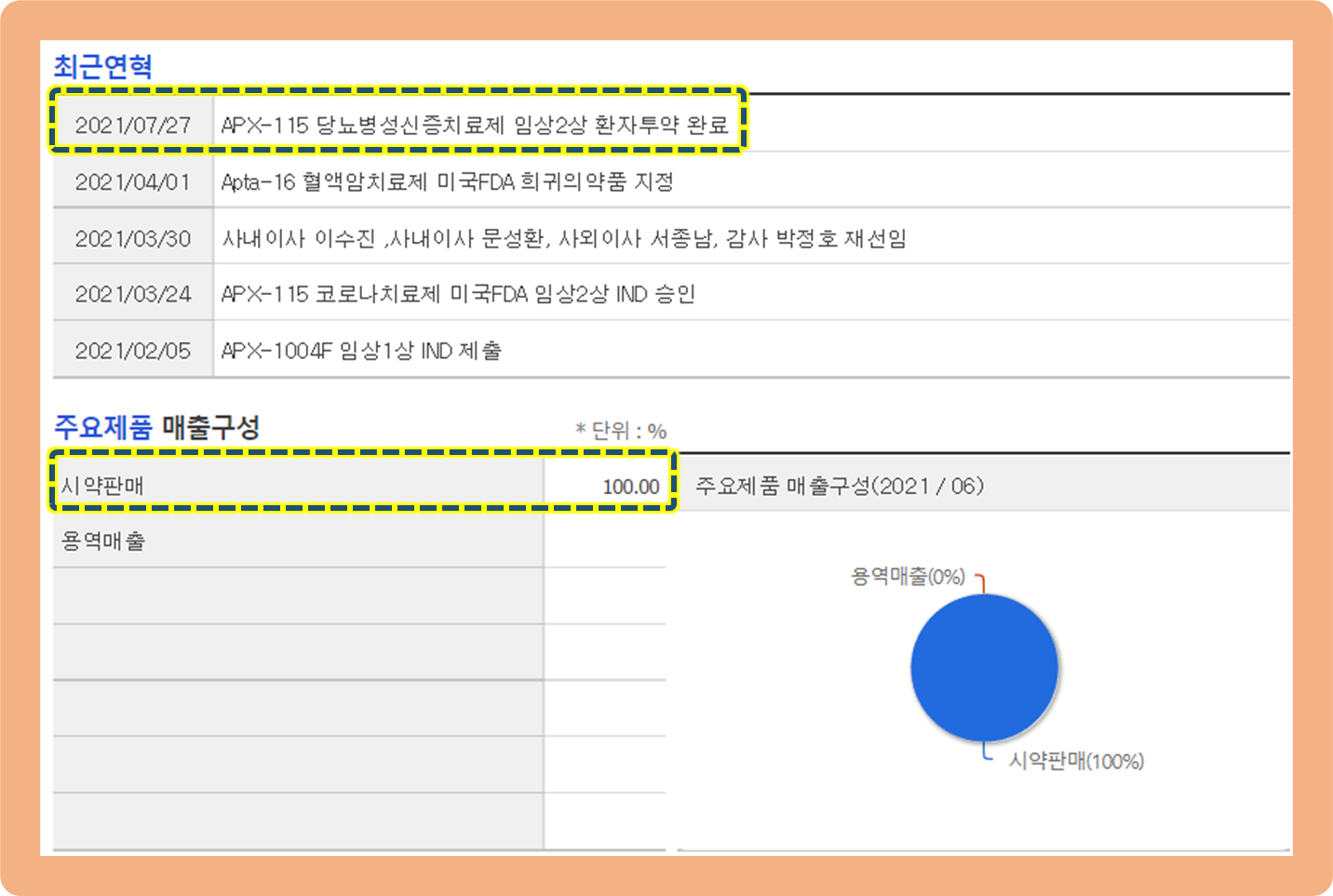 압타바이오의 최근 연혁과 매출 비중을 비교해보도록 하겠습니다.