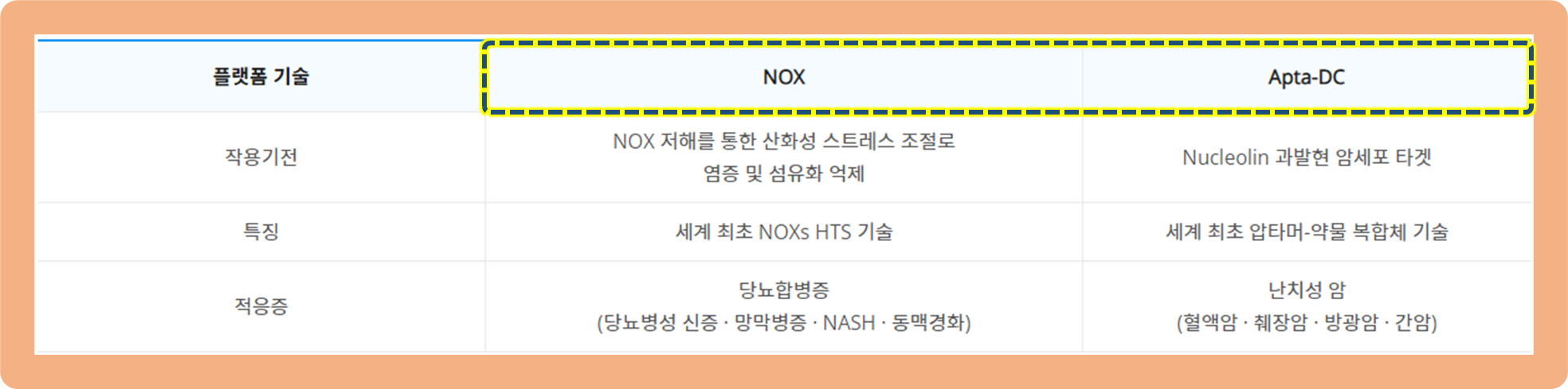 또한, 자체 보유 중인 핵심기술인 NOX저해제 발굴 플랫폼을 통해 당뇨합병증 신약 파이프라인 8종을 개발한 바 있으며, Apta-DC(압터머-약물 복합제) 플랫폼을 통해 난치성 항암제 파이프라인 3종을 개발한 바 있죠.
