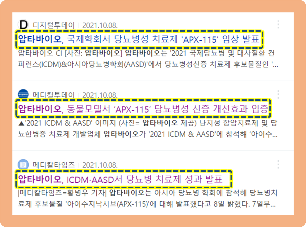 지난 2021년 10월 8일, 압타바이오는가 아시아 당뇨병 학회에서 당뇨병치료제 후보물질인 APX-115(아이수지낙시브)에 관해 발표했다고 하는데요.
