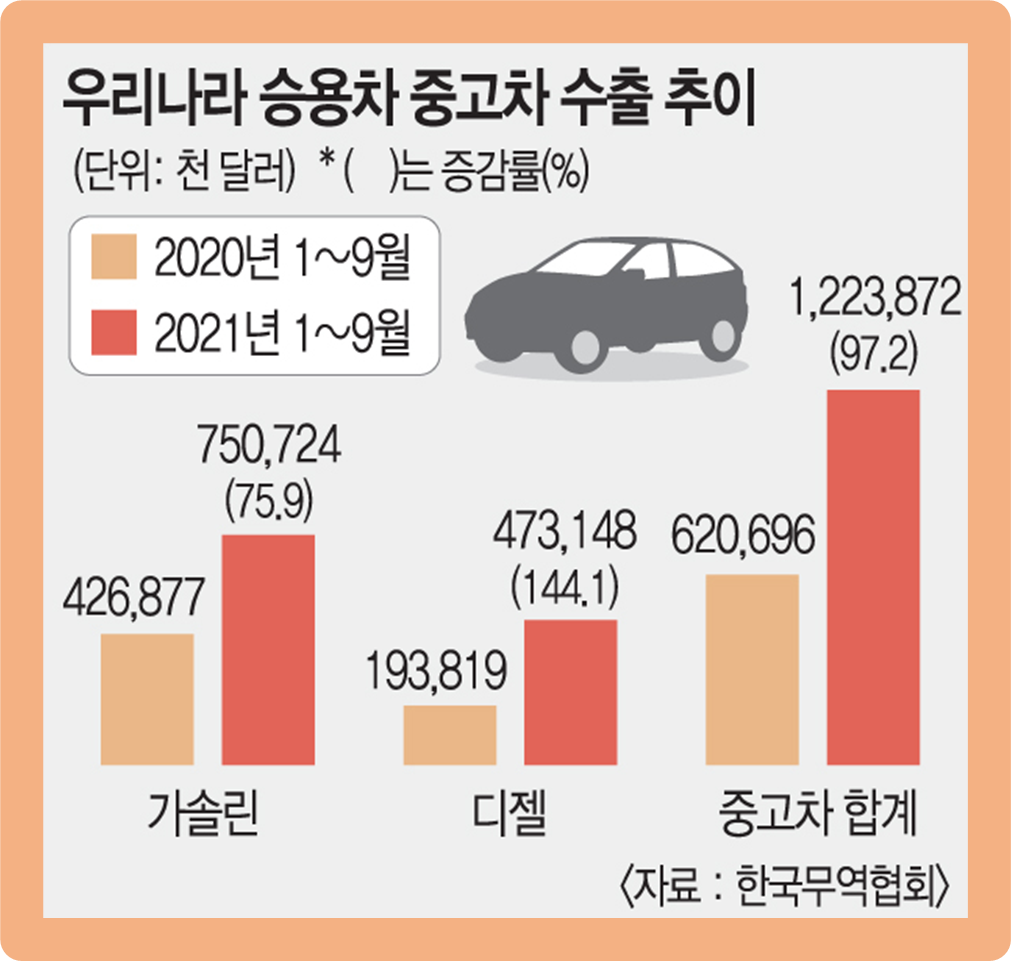 그리고 한국무역협회에 의하면 2021년 9월까지의 누적 중고차 수출액은 전년도 같은 기간 기록했던 6억2069만 달러 대비 약 97.2% 상승한 12억2387만 달러까지 치솟았다고 하는데요.