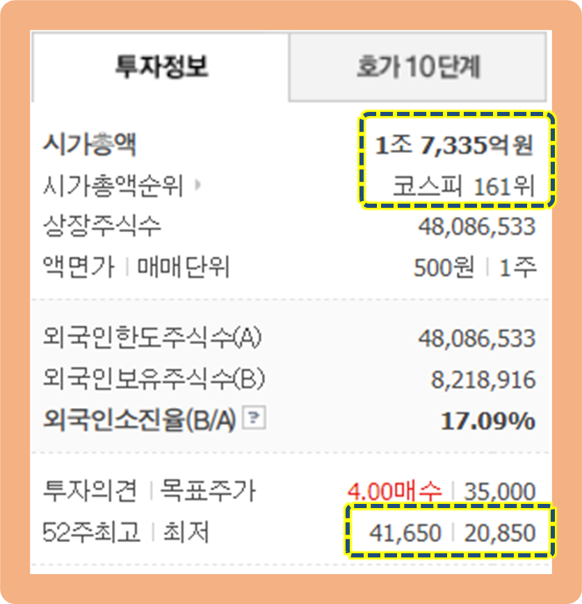 52주 최고가는 41,650원이고, 52주 최저가는 20,850원인데요.