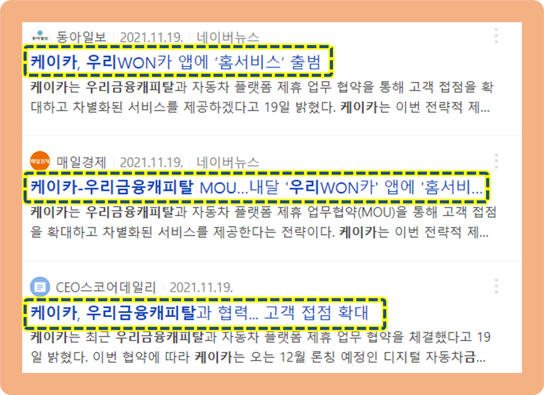 지난 2021년 11월 19일, 케이카가 우리금융캐피탈와 자동차 플랫폼 업무 협약을 체결했다고 발표했습니다.
