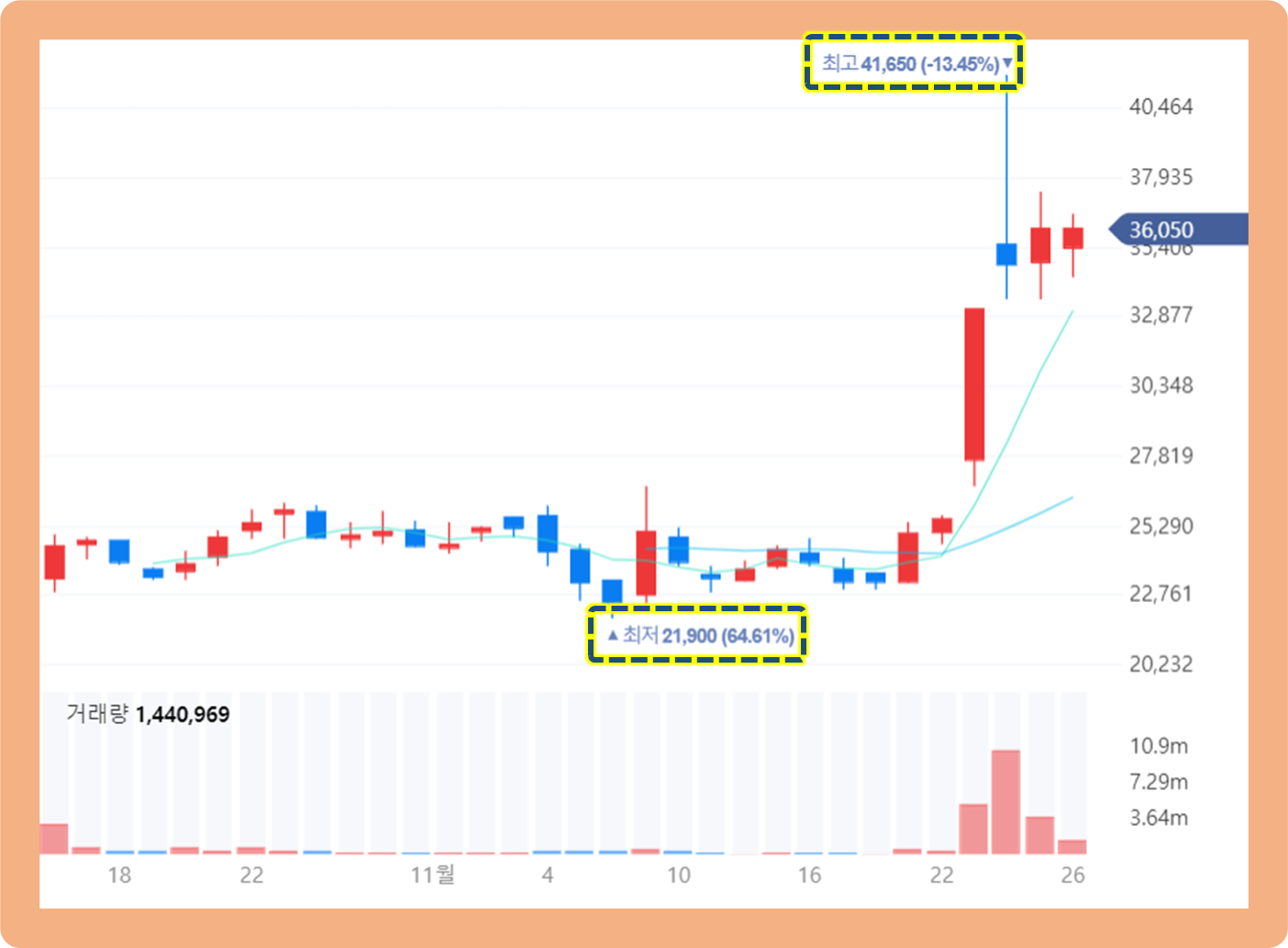 지난 2021년 11월 19일부터 주가가 갑자기 상승하기 시작하더니, 2021년 11월 24일에는 최고 41,650원까지 터치했습니다.