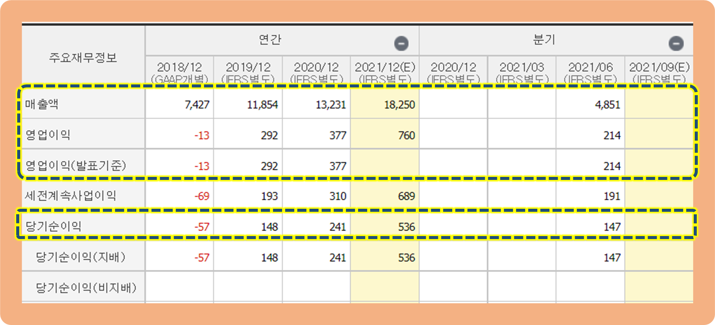 그리고 영업이익과 당기순이익은 2019년도만 해도 적자를 기록하고 있었는데요.