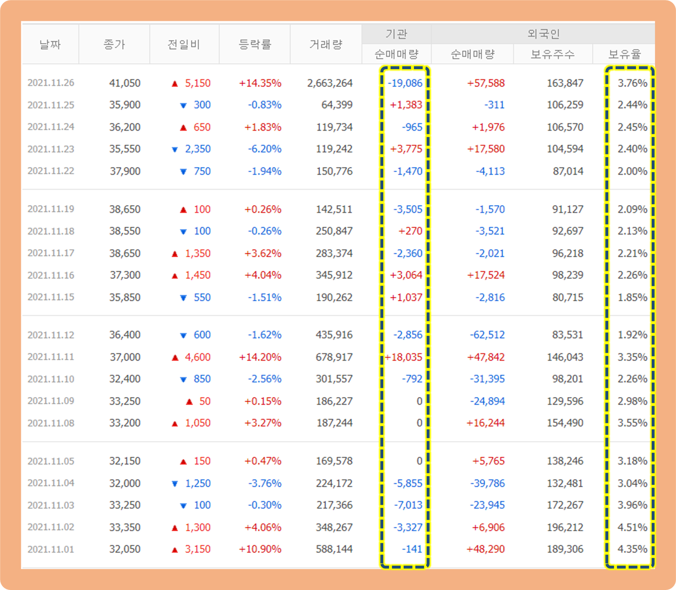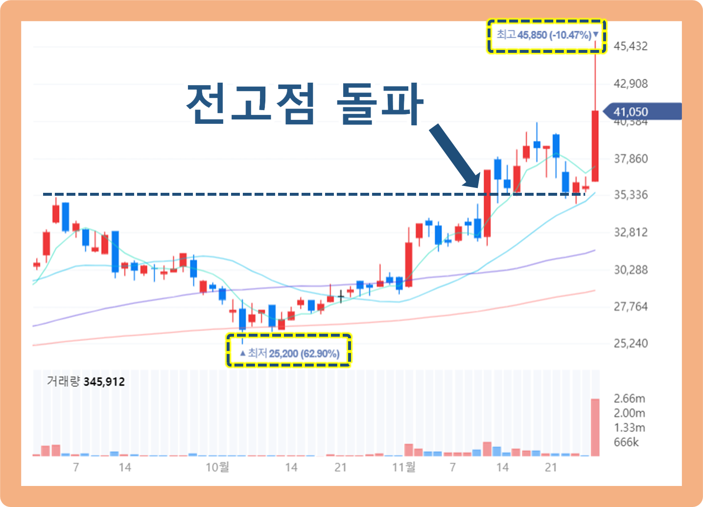상승세가 이어지면서 지난 9월 초에 기록했던 전고점을 돌파하였으며, 2021년 11월 27일에는 최고 45,850원까지 터치 후 41,050원에 장을 마감한 상황이네요.