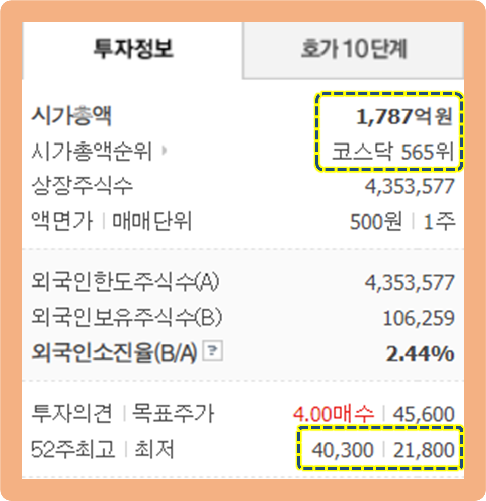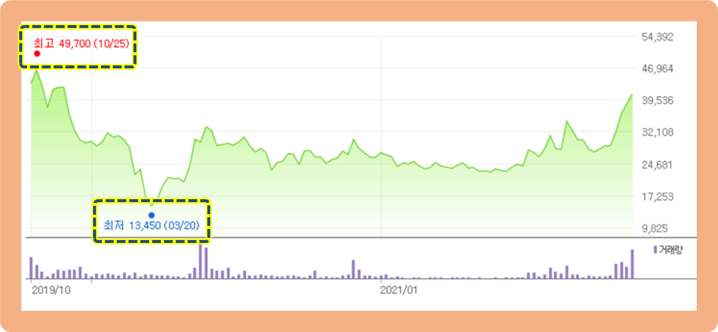 최고가는 2019년 10월에 기록한 49,700원이며, 최저가는 2020년 3월에 기록한 13,450원인데요.