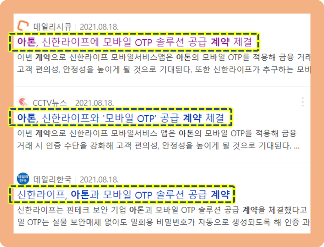 지난 2021년 8월, 아톤이 신한라이프와도 모바일 OTP 솔루션 공급 계약을 체결했다는 소식을 발표했습니다.