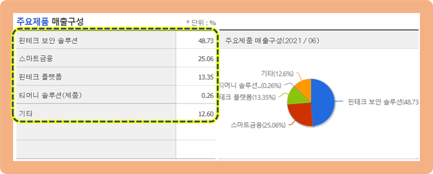 우선 핀테크 보안 솔루션 부문이 약 48.7% 수준을 차지하며 매출의 절반을 책임지고 있는 모습입니다.