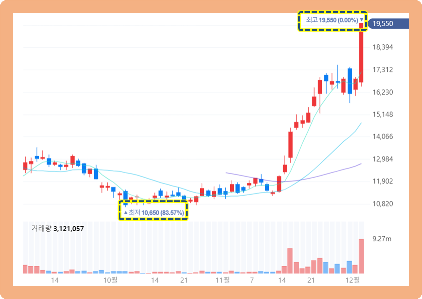 최근까지 계속해서 상승세를 보이고 있으며, 2021년 12월 2일에는 장대양봉이 나타나면서 19,550원에 장을 마감한 상황입니다.